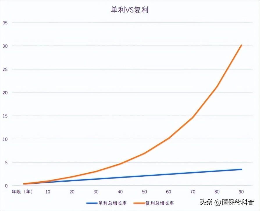 像银行定存和国债都是单利计息,而增额寿和年金险的收益是复利计息,投入的时间越长,复利的威力越是能体现出来: