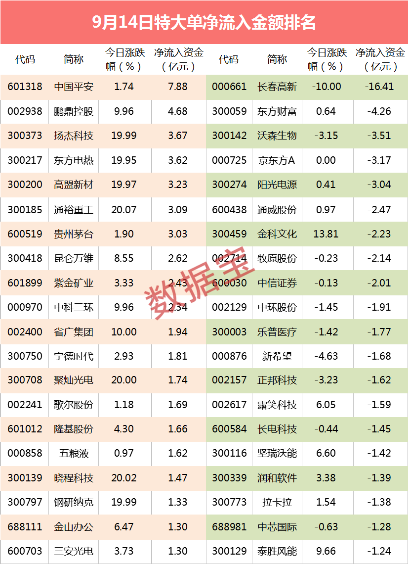 今日光伏、风能等新能源概念股大涨,但多只龙头股资金流出居前,阳光电源大单资金流出3亿元,通威股份流出超2亿元,中环股份、泰胜风能流出超亿元。