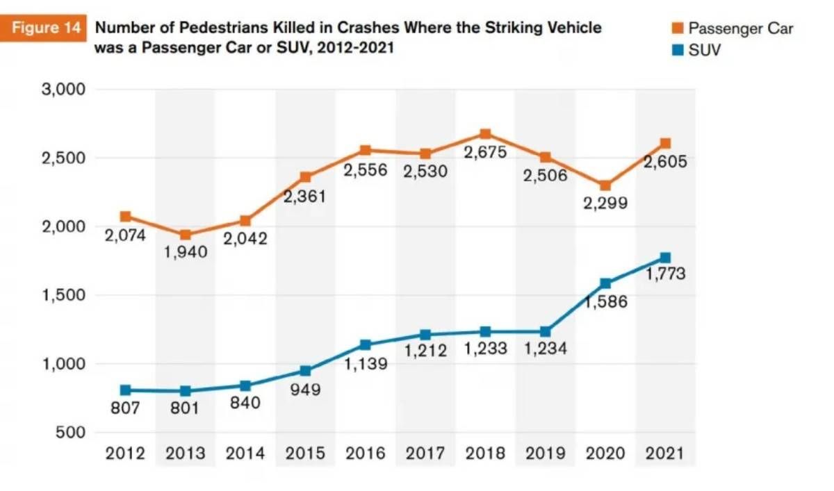 因为 SUV/皮卡死亡的行人数量正在急速增加,以 SUV/皮卡为代表的大尺寸车型正在成为马路上下一个「危险车型」。