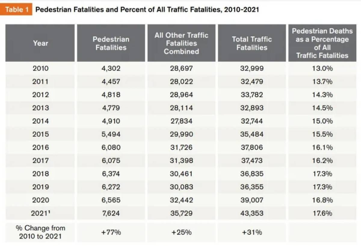这还不是更糟的,美国州长公路安全协会(GHSA)汇总了本土各州的行人交通事故情况,最终数据显示,在 2022 年全美约有 7500 名行人在交通事故中丧生,这一项数据占据到所有交通死亡人数的 17%。