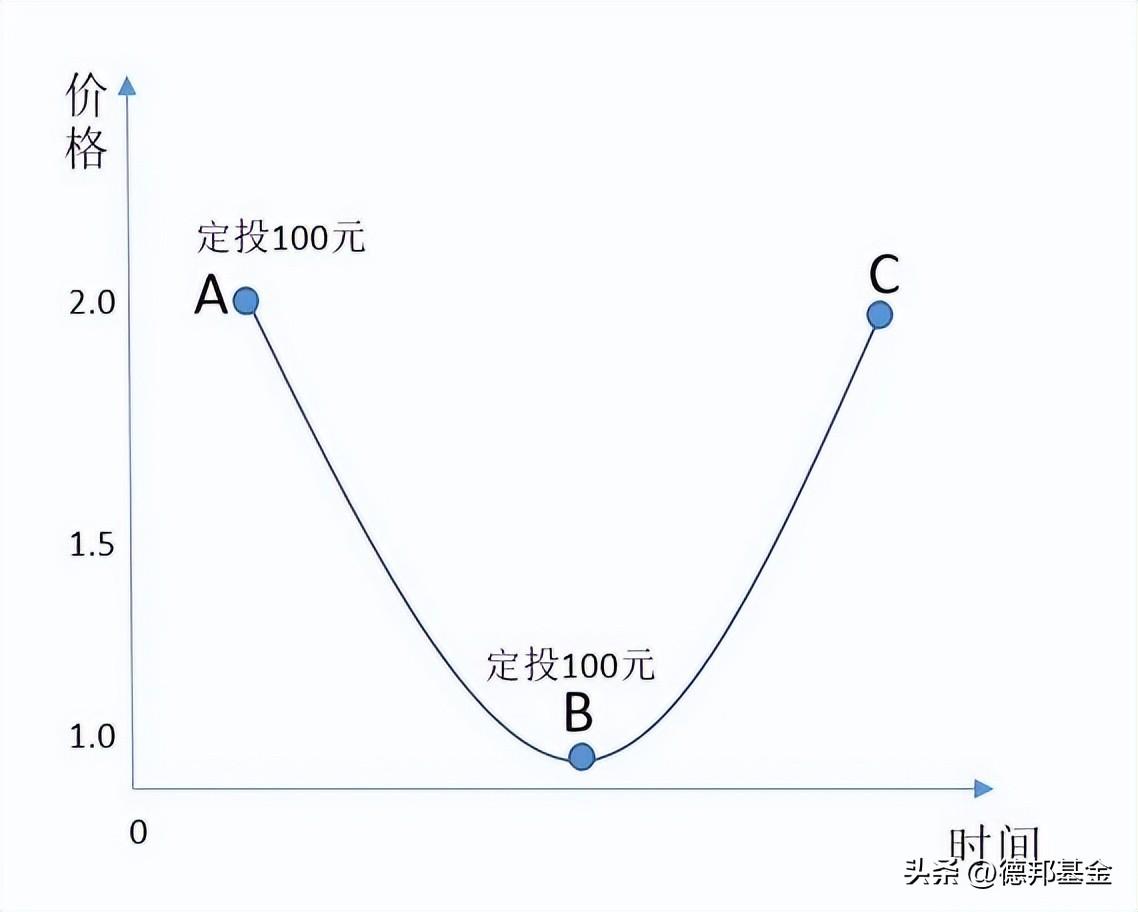 如果在A点买入100元,买入50份额;到B点再买入100元,买入100份额,等到市场涨回C点,则买入总份额为150份,总资产达到300元,累计收益率为50%。在市场行情下行时,多次小额持续投入,
