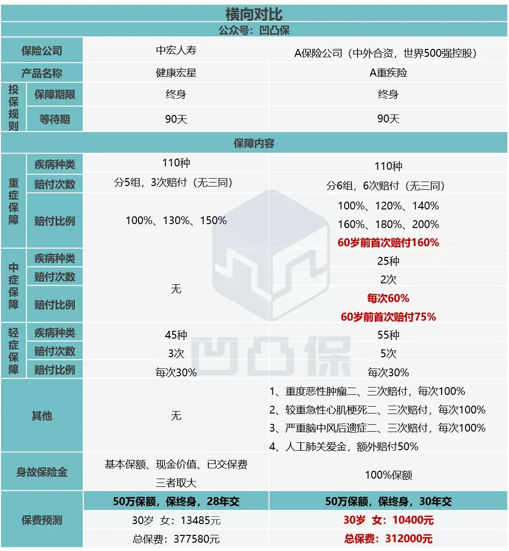 但是A重疾还有60岁前首次重疾额外赔付60%,举例:50万保额,50岁患首次重疾肝癌,健康宏星可以赔50万,A重疾可以赔80万。