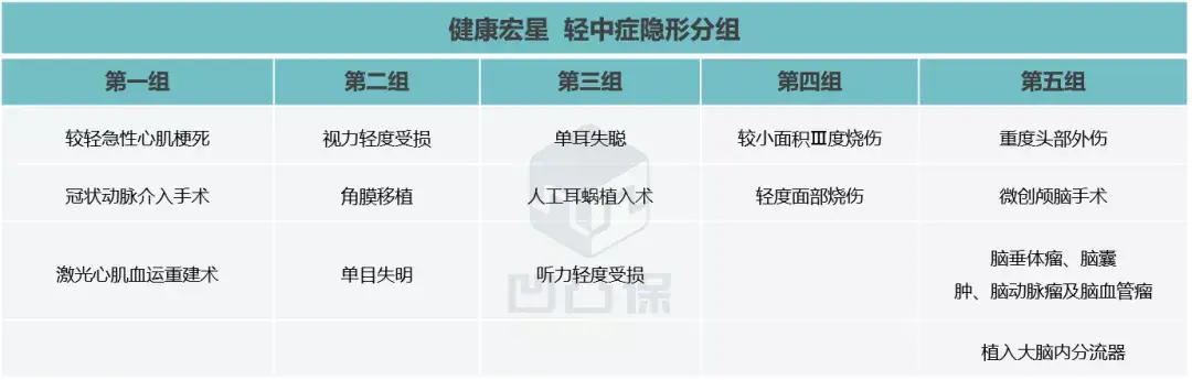 隐性分组是大部分重疾险的通病,表面上不分组,实际上同类的疾病只赔付其中一种。健康宏星保障的轻症病种有45种,涉及到隐性分组的病种有15种,分组达到5组。