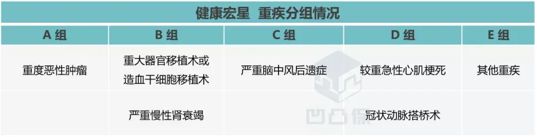 下表是健康宏星的重疾分组情况,重度恶性肿瘤可认定为单独分一组,其他5大高发重疾分布均匀且合理。