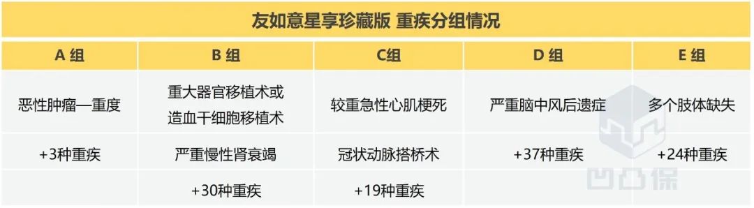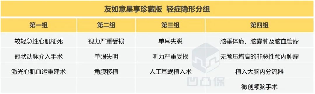 隐形分组是大部分重疾险的通病,表面上不分组,实际上同类的疾病只赔付其中一种。友如意星享珍藏版的轻症病种有40种,涉及到隐性分组的病种有13种,分组达到4组,这个隐性分组属于中规中矩。