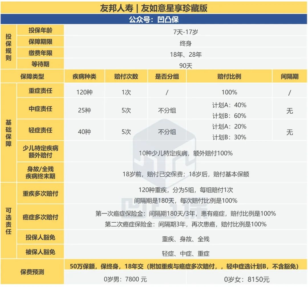 友如意星享珍藏版作为开门红期间的少儿重疾险,相比较于友如意星享版,仅仅是少交2年的保费,保障责任一模一样,没有任何变化,站在友邦人寿的角度来看,也算是小小的福利。