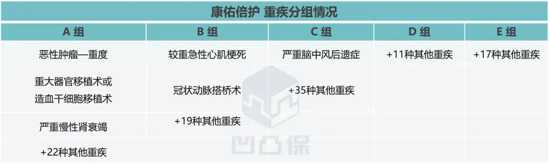 康佑倍护的重疾责任是把100种重疾分5组,5次赔付,分组多次赔付的重疾,分组是否合理比较关键,而判断分组是否合理主要看6种高发重疾的分散程度,越分散越好。