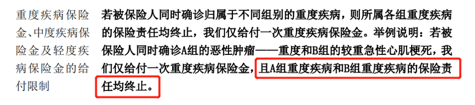 当同时确诊两种或以上重疾,仅赔付其中一种,之后已经确诊的重疾就会被免责,这个可以理解,这是重疾险常规的赔付方式。
