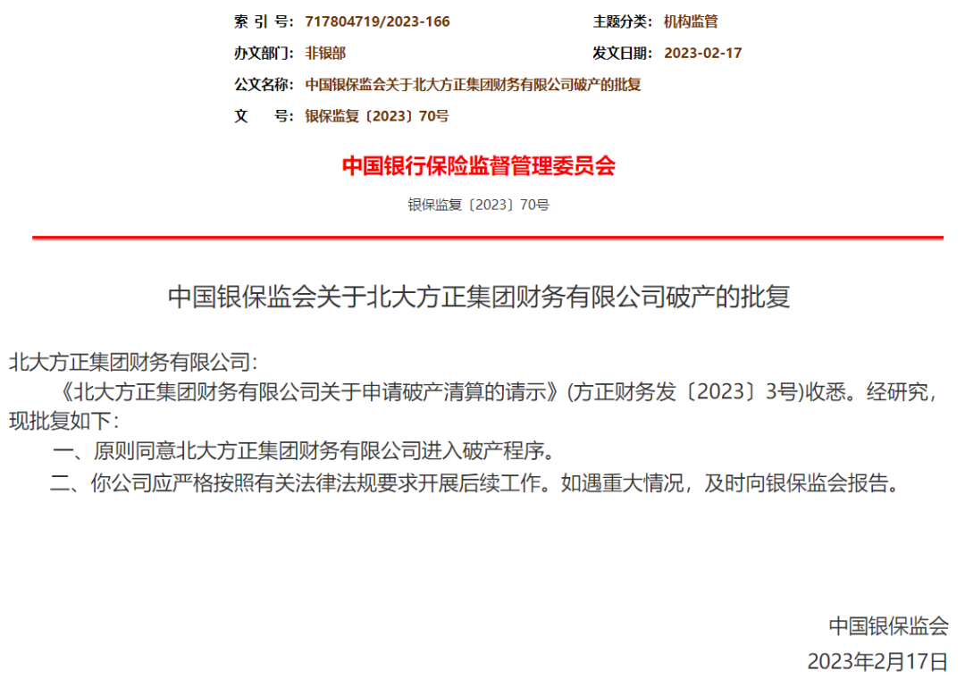据中国银行保险监督管理委员会下发的银保监复〔2023〕70号文件,银保监会已收悉北大方正集团财务有限公司(简称:方正财务)关于申请破产清算的请示文件(方正财务发〔2023〕3号)。经研究,银保监会原则同意方正财务进入破产程序。